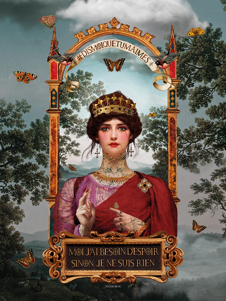 I Espoir, ”hopp”, möter vi en drottninglik gestalt som kunde ha stigit rakt ur ett historiskt porträtt, men här omskapad genom Voglio Benes karakteristiska blandning av klassicism och samtida symbolik. Hennes blick är mild och trotsig på samma gång, inramad av ett himmelskt sceneri där fjärilar, moln och ornamenterade bågar antyder en värld mellan bön och dröm.