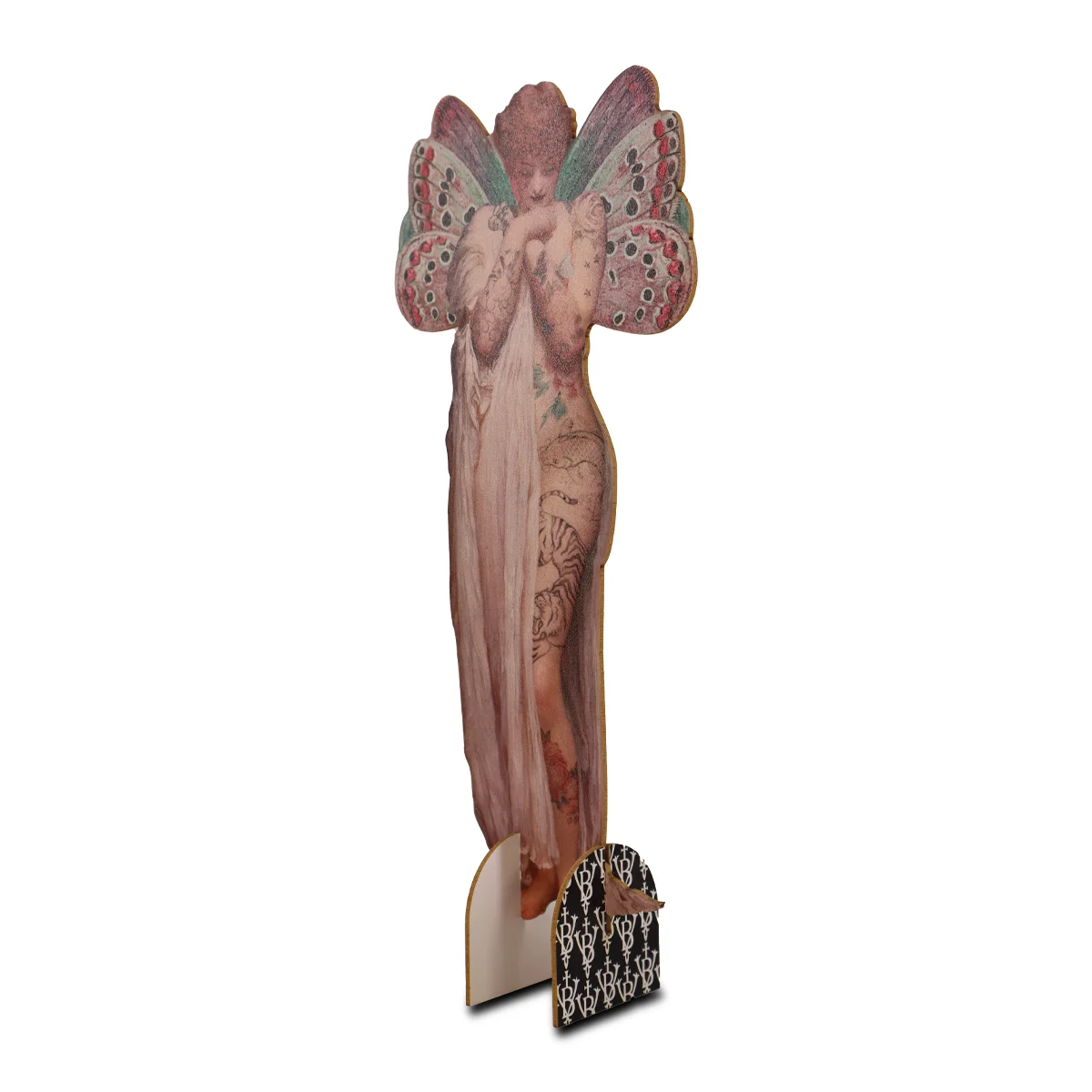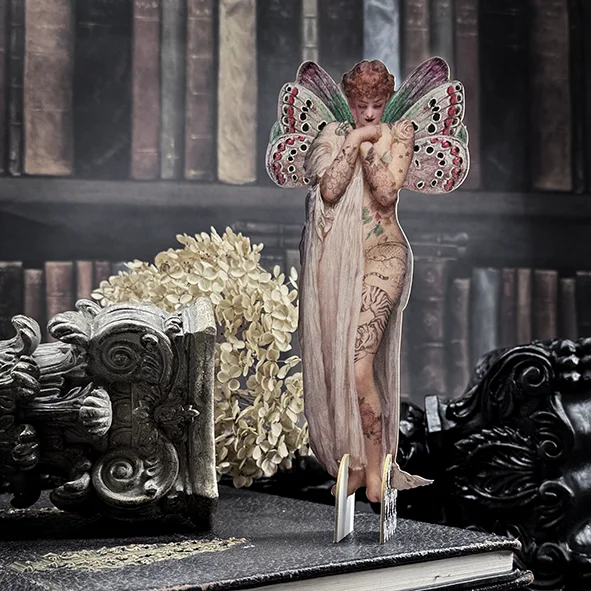 Motivet ”Angel” föreställer en gåtfull ängel eller fégestalt med skimrande fjärilsvingar i rosentoner och turkost. Den nakna kroppen är täckt av tatueringar: blommor, stjärnor, ormar och en tiger – som om hon bar hela sin hemliga mytologi skriven på huden. Draperad i slöjor står hon där med sänkt blick, på samma gång oskuldsfull och farlig, som en varelse ur en dekadent dröm eller en symbolistisk målning.