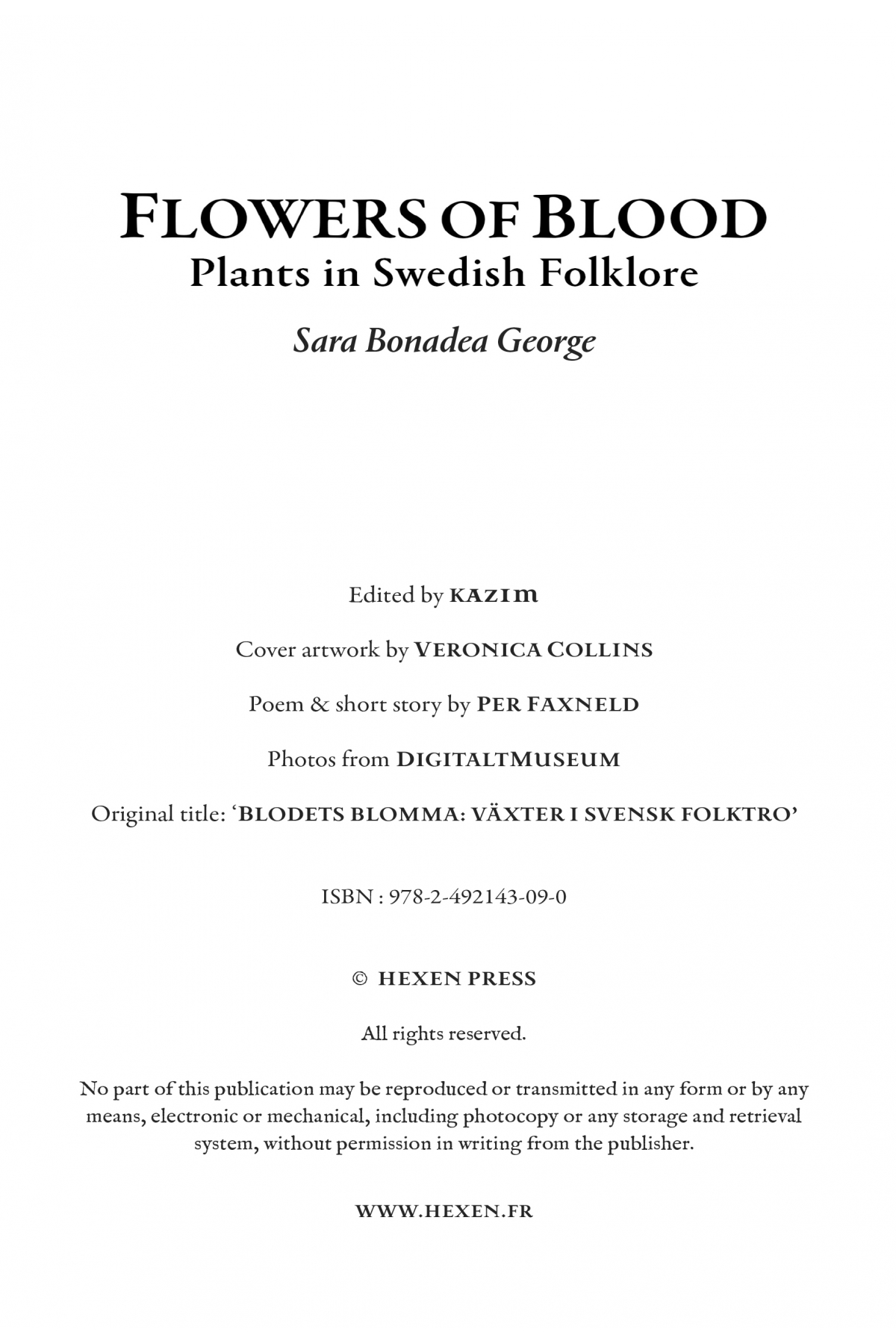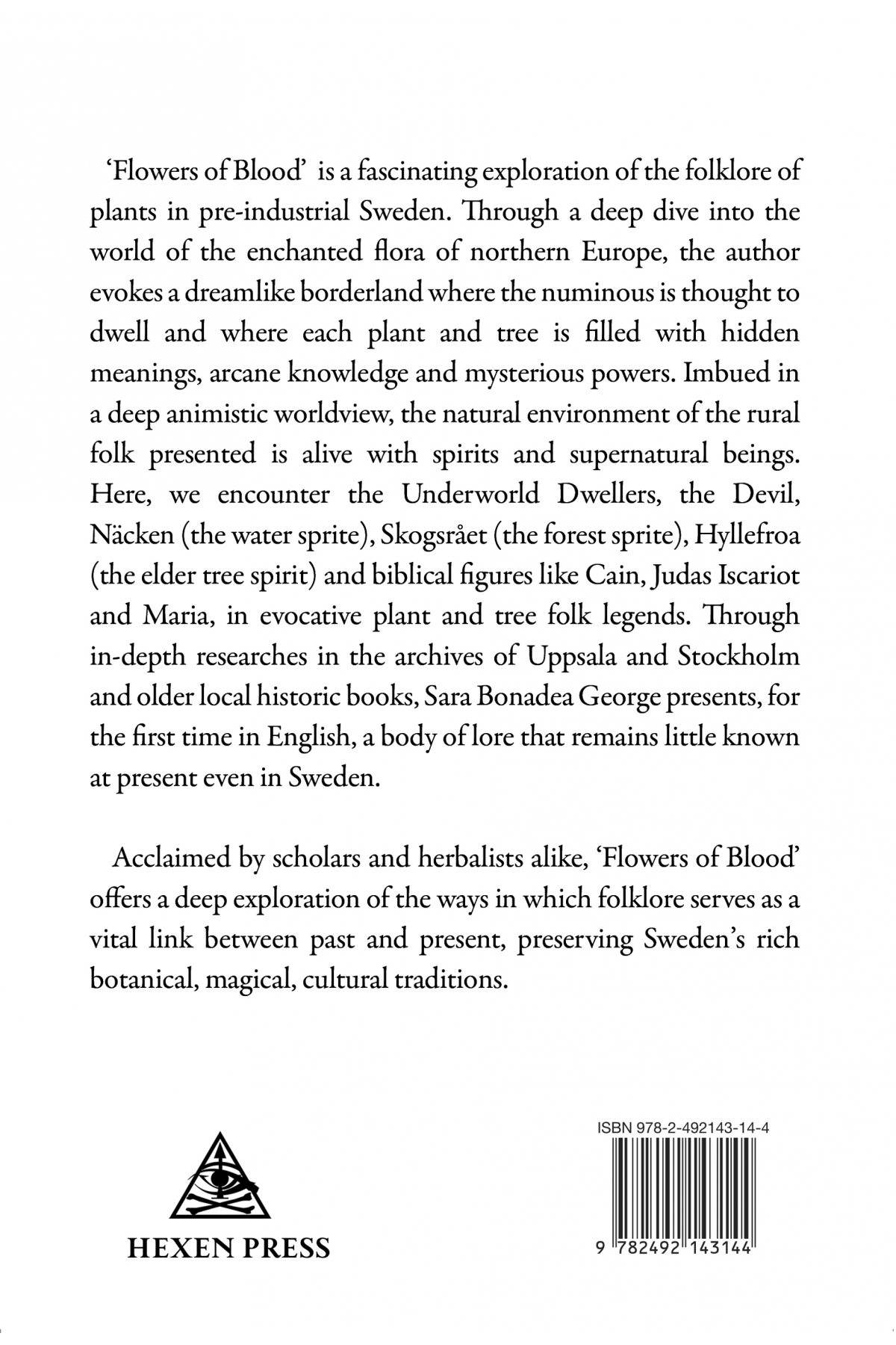 Flowers of Blood is a fascinating exploration of the folklore of plants in pre-industrial Sweden. Through a deep dive into the world of the enchanted flora of northern Europe, the author evokes a dreamlike borderland where the numinous is thought to dwell and where each plant and tree is filled with hidden meanings, arcane knowledge and mysterious powers. Imbued in a deep animistic worldview, the natural environment of the rural folk presented is alive with spirits and supernatural beings. Here, we encounter the Underworld Dwellers, the Devil, Näcken (the water sprite), Skogsrået (the forest sprite), Hyllefroa (the elder tree spirit) and biblical figures like Cain, Judas Iscariot and Maria, in evocative plant and tree folk legends. Through in-depth researches in the archives of Uppsala and Stockholm and older local historic books, Sara Bonadea George presents, for the first time in English, a body of lore that remains little known at present even in Sweden.