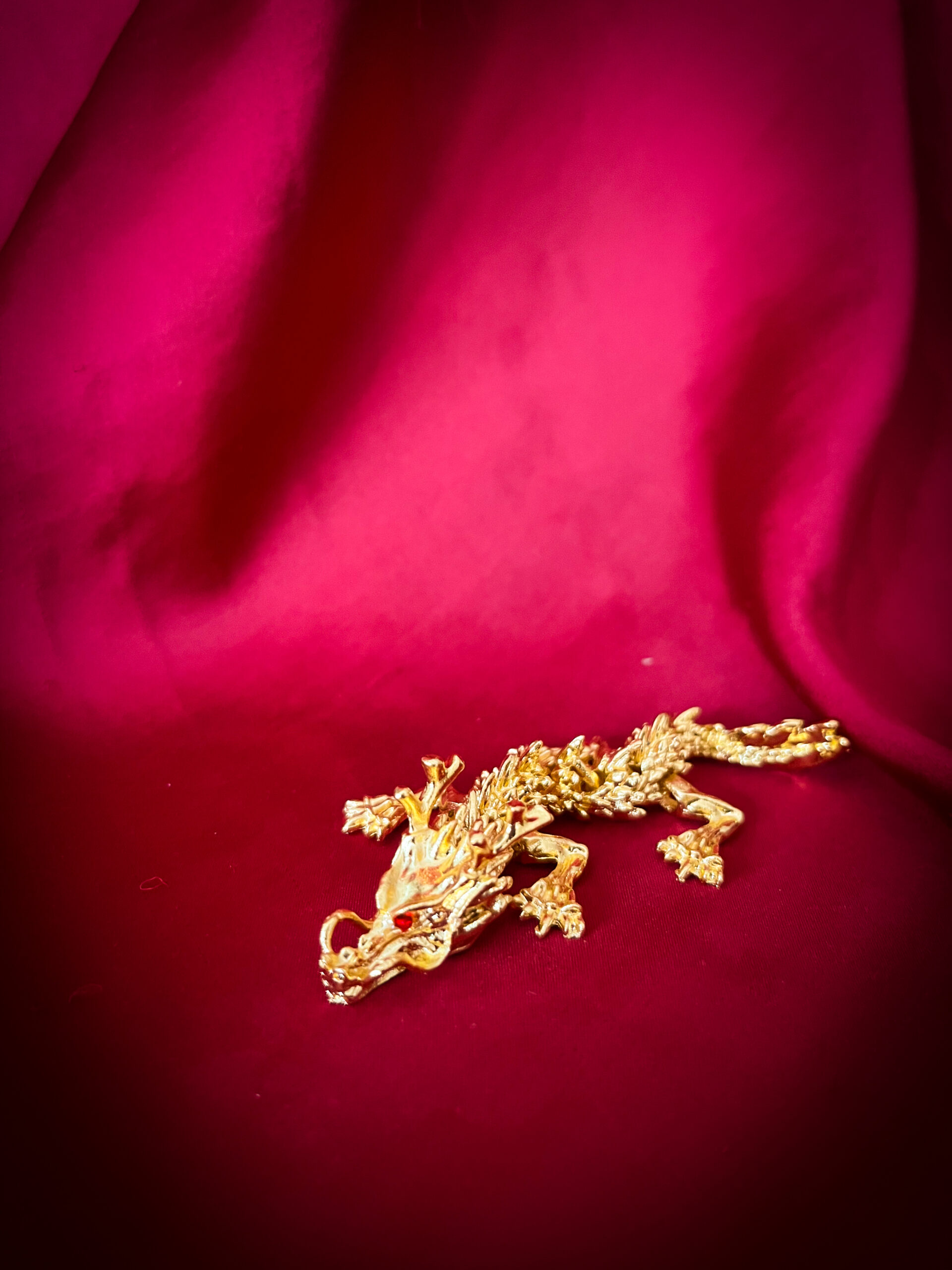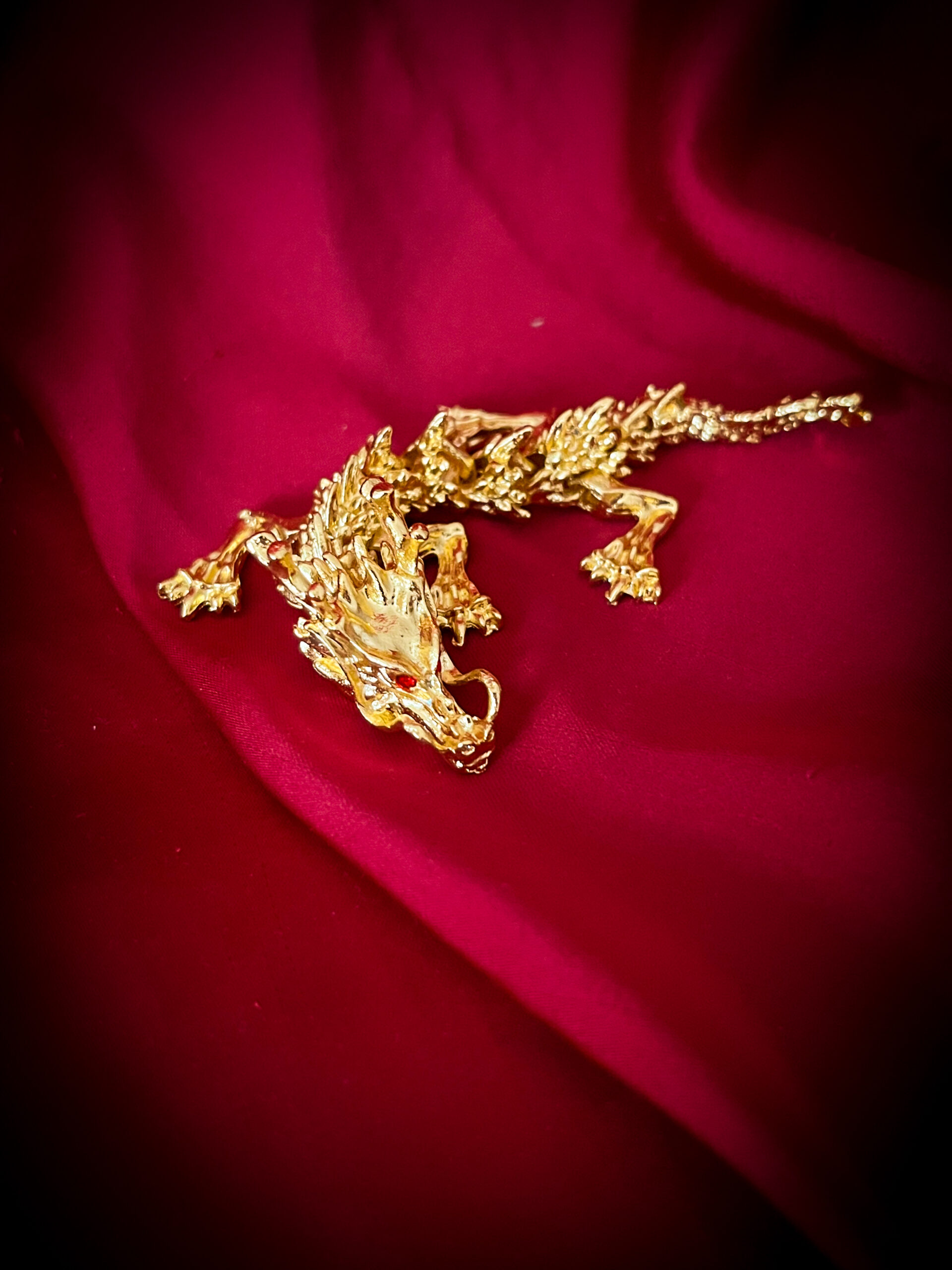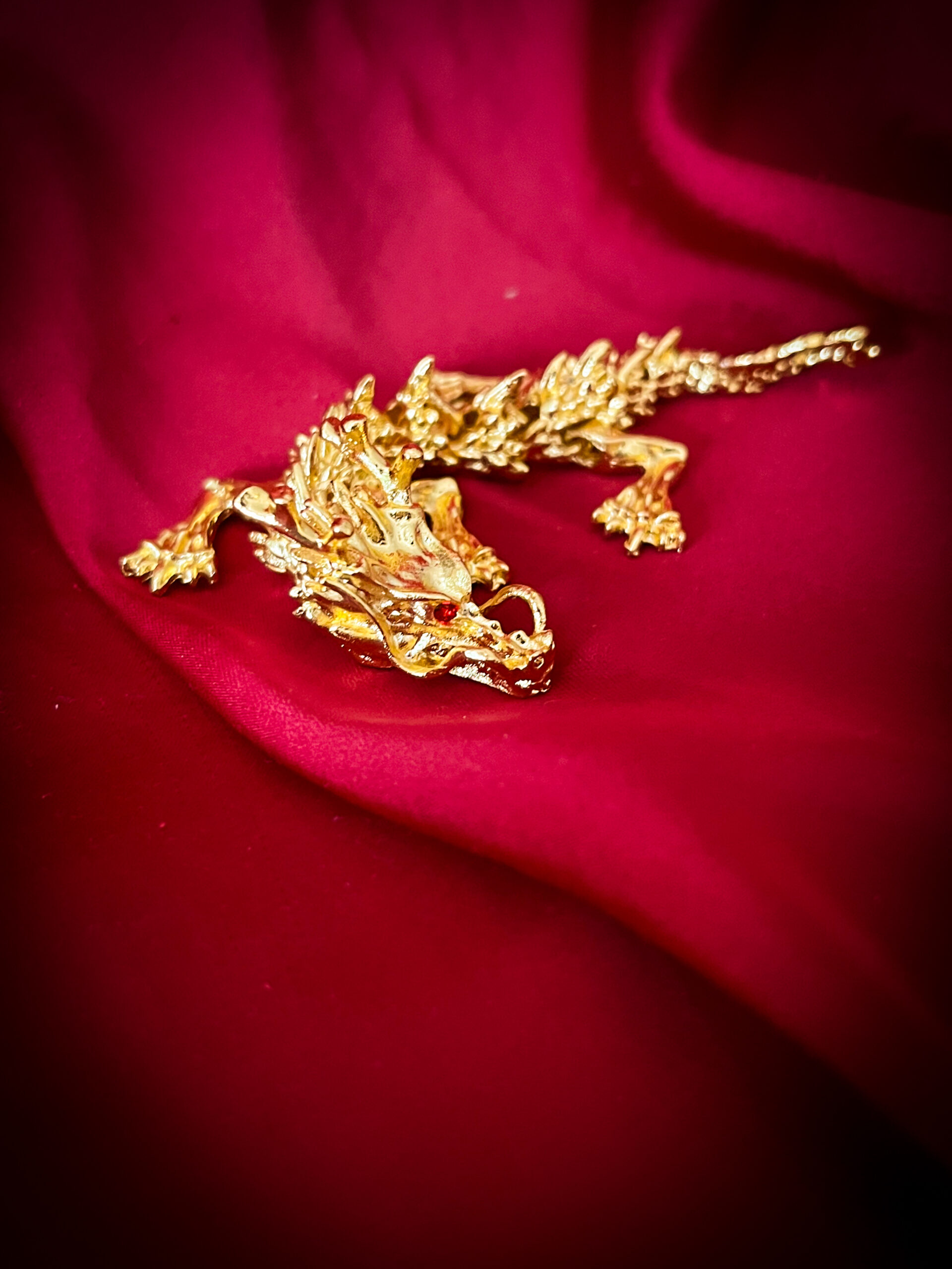 En liten, detaljrik drake i mässing – lika smäckert utformad som sina större släktingar, men i ett nättare format som gör den lätt att placera i vilken kuriosahylla som helst. Med sina röda ögon och den ledade kroppen blir den ett charmigt mytologiskt inslag i hemmet.