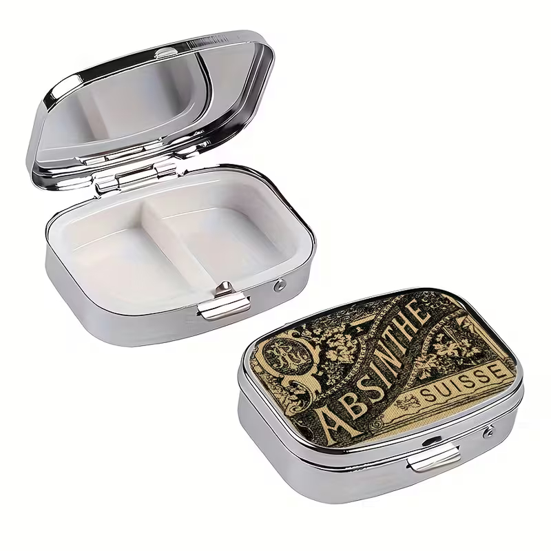 En elegant pillerask med ett vintageinspirerat absintetikettmotiv, hämtat från den tid då la fée verte förförde poeter, konstnärer och nattlivets drömmare. Perfekt för den som vill bära med sig en fläkt av fin-de-siècle-estetik i fickan – lika mycket kuriosa som praktisk vardagsdetalj.