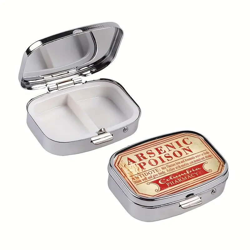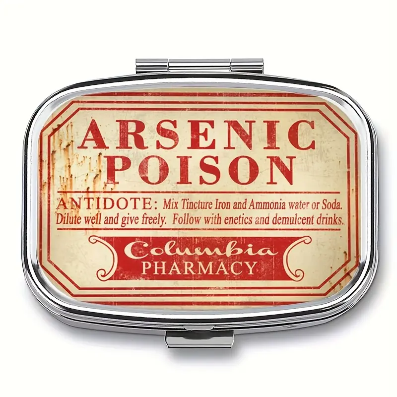 En liten metallask med vintageinspirerad etikett: Arsenic Poison. Asken har två fack på insidan och är perfekt för tabletter, småsaker eller hemliga skatter. Passar lika bra i handväskan som på skrivbordet.