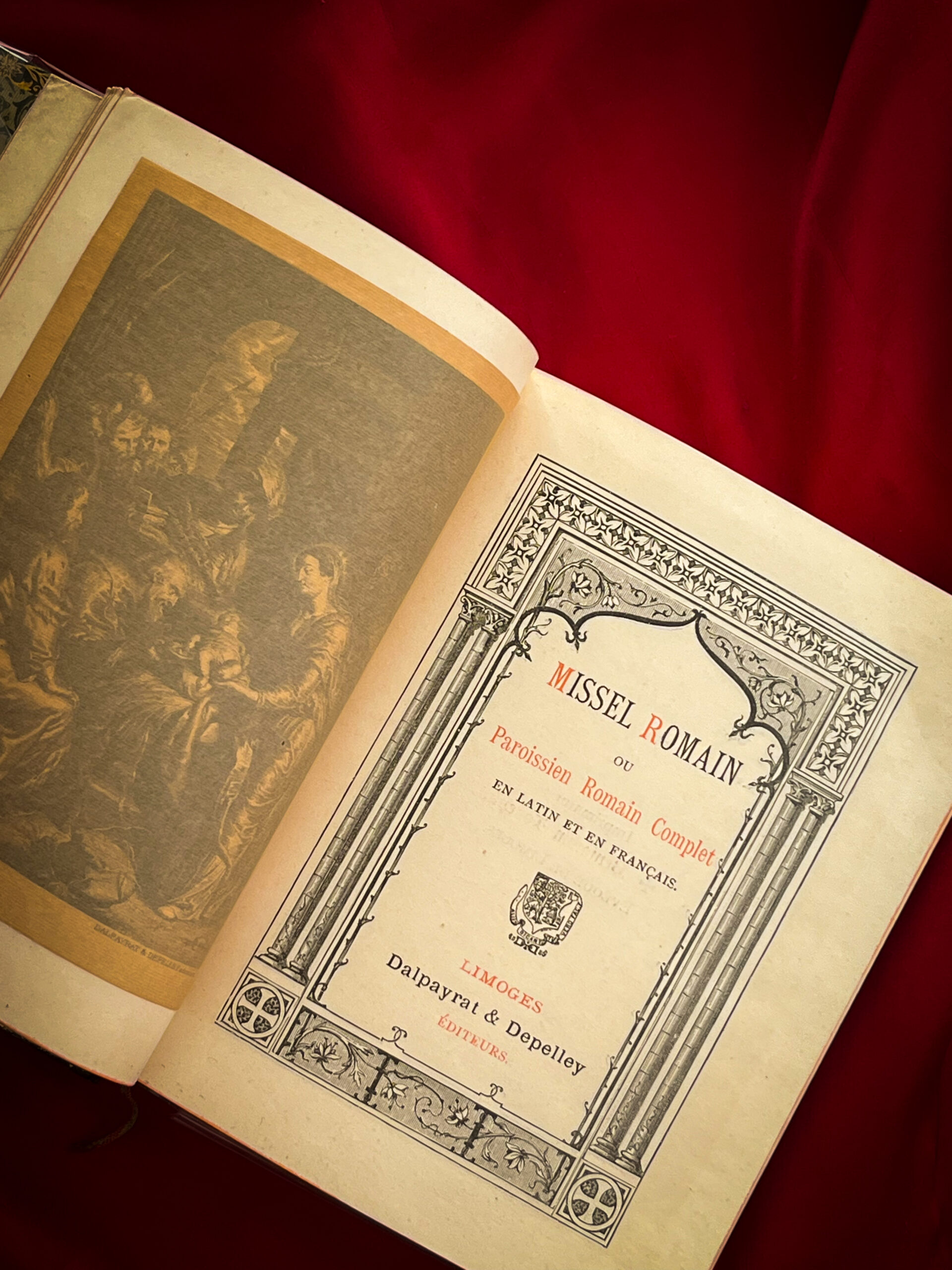 Ett vackert franskt missale, inköpt i Lyon, med text på både latin och franska. Utgivet av Dalpayrat & Depelley i Limoges kring sekelskiftet 1900 (tryckt ca 1896). Omslag i skinn med guldprägling (med modernt plastskydd på bilden).