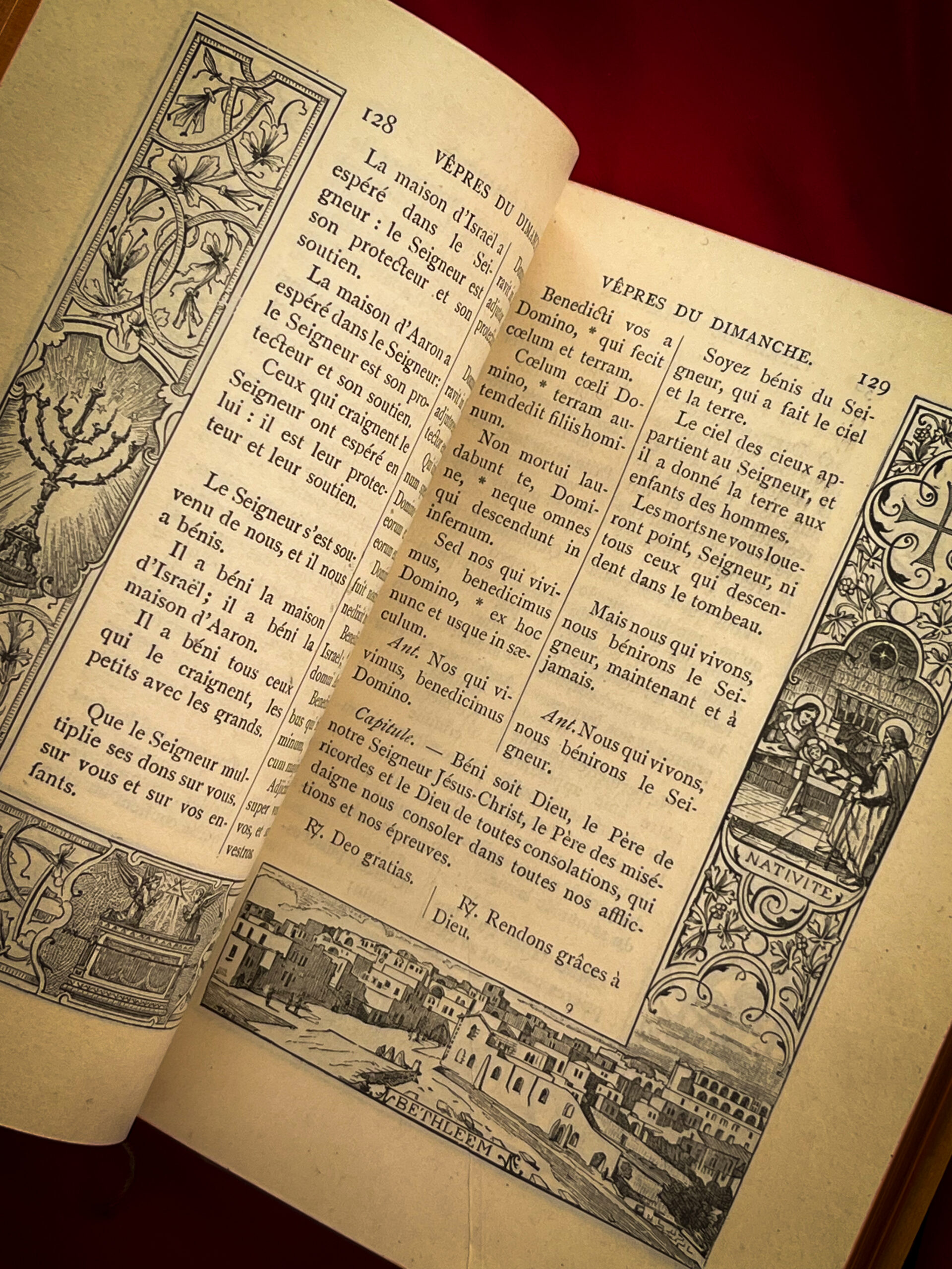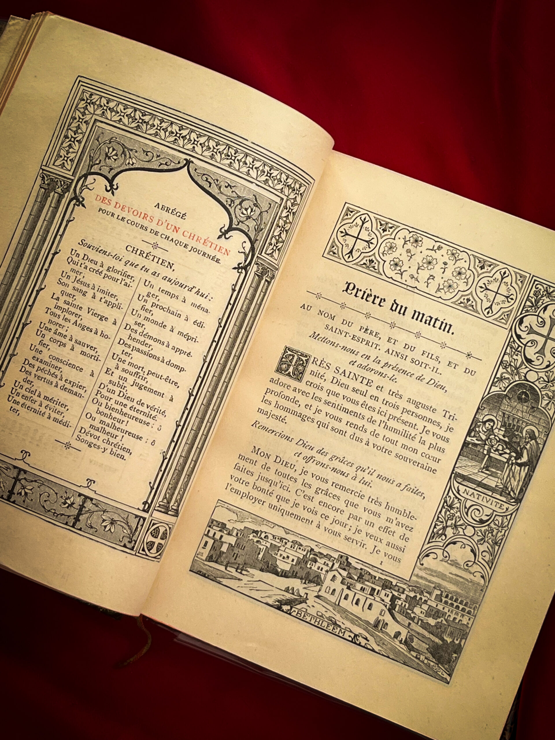 Boken har guldsnitt, dekorativt tryckta ramar kring texten och illustrationer i form av heliga motiv och stadsvyer (t.ex. Betlehem och Via Dolorosa). Den inleds med en introduktion till de troendes dagliga plikter och innehåller böner, hymner och mässans texter.